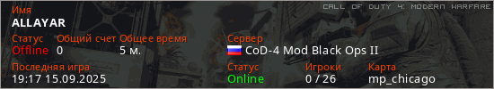 Играет на Call of Duty 4: Modern Warfare сервере. Страна: РоссияПервый раз замечен 19:13 15.09.2025
