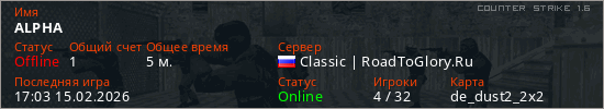 Играет на Counter Strike 1.6 сервере. Страна: РоссияПервый раз замечен 16:59 15.02.2026