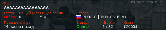 Играет на Counter Strike 1.6 сервере. Страна: РоссияПервый раз замечен 21:49 29.03.2026