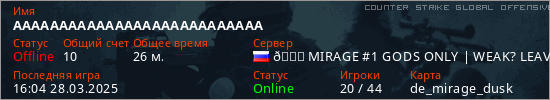 Играет на Counter Strike Global Offensive сервере. Страна: РоссияПервый раз замечен 19:14 24.03.2025