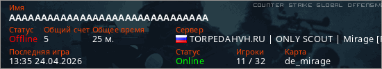Последний раз был в сети 13:35 24.04.2026 Игрок с таким ником замечен на 32 серверах
