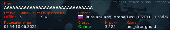 Играет на Counter Strike Global Offensive сервере. Страна: РоссияПервый раз замечен 20:58 03.04.2025