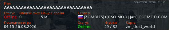 Играет на Counter Strike 1.6 сервере. Страна: РоссияПервый раз замечен 04:13 26.03.2026