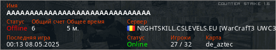Последний раз был в сети 00:13 08.05.2025 Игрок с таким ником замечен на 29 серверах