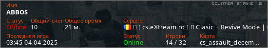 Играет на Counter Strike 1.6 сервере. Страна: РумынияПервый раз замечен 11:16 27.02.2025