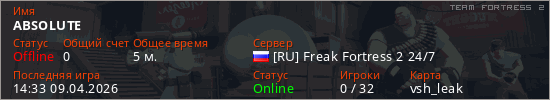 Играет на Team Fortress 2 сервере. Страна: РоссияПервый раз замечен 14:22 09.04.2026