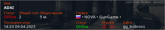 Играет на Counter Strike Source сервере. Страна: РоссияПервый раз замечен 14:31 09.04.2025