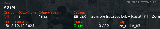 Играет на Counter Strike 1.6 сервере. Страна: СШАПервый раз замечен 17:59 12.12.2025