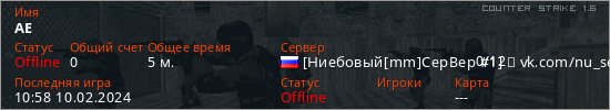 Играет на Counter Strike 1.6 сервере. Страна: РоссияПервый раз замечен 10:50 10.02.2024