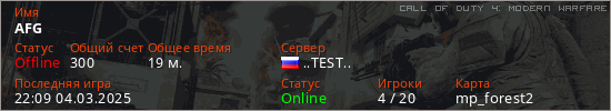 Играет на Call of Duty 4: Modern Warfare сервере. Страна: РоссияПервый раз замечен 21:44 04.03.2025