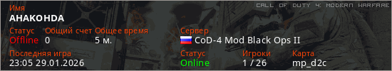 Играет на Call of Duty 4: Modern Warfare сервере. Страна: РоссияПервый раз замечен 23:03 29.01.2026