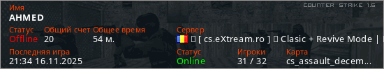 Играет на Counter Strike 1.6 сервере. Страна: РумынияПервый раз замечен 14:54 06.01.2025