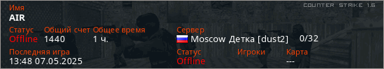 Играет на Counter Strike 1.6 сервере. Страна: РоссияПервый раз замечен 11:03 03.12.2024