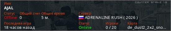 Играет на Counter Strike 1.6 сервере. Страна: РоссияПервый раз замечен 17:11 03.02.2026