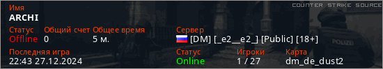 Играет на Counter Strike Source сервере. Страна: РоссияПервый раз замечен 22:27 27.12.2024
