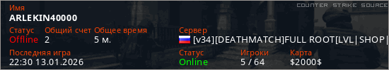 Играет на Counter Strike Source сервере. Страна: РоссияПервый раз замечен 22:26 13.01.2026