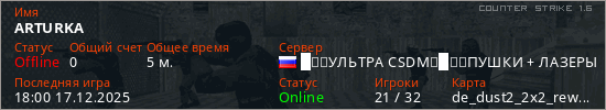 Играет на Counter Strike 1.6 сервере. Страна: РоссияПервый раз замечен 17:58 17.12.2025