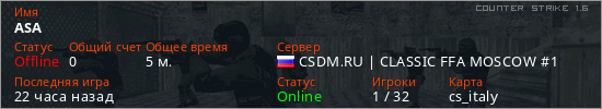 Играет на Counter Strike 1.6 сервере. Страна: РоссияПервый раз замечен 20:47 04.03.2026