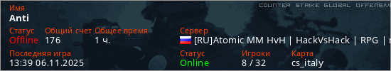 Играет на Counter Strike Global Offensive сервере. Страна: РоссияПервый раз замечен 11:10 25.09.2025