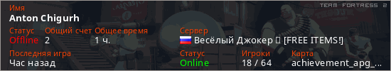 Играет на Team Fortress 2 сервере. Страна: РоссияПервый раз замечен 20:26 11.03.2026