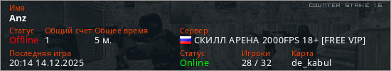 Играет на Counter Strike 1.6 сервере. Страна: РоссияПервый раз замечен 19:47 14.12.2025