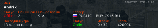 Играет на Counter Strike 1.6 сервере. Страна: РоссияПервый раз замечен 20:49 29.03.2026