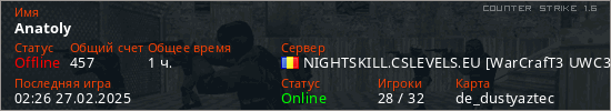 Играет на Counter Strike 1.6 сервере. Страна: РумынияПервый раз замечен 02:19 22.02.2025