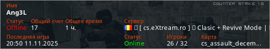 Играет на Counter Strike 1.6 сервере. Страна: РумынияПервый раз замечен 01:41 07.03.2025