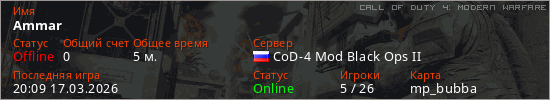 Играет на Call of Duty 4: Modern Warfare сервере. Страна: РоссияПервый раз замечен 20:07 17.03.2026