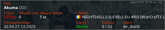 Играет на Counter Strike 1.6 сервере. Страна: РумынияПервый раз замечен 22:52 27.12.2025