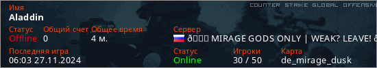 Играет на Counter Strike Global Offensive сервере. Страна: РоссияПервый раз замечен 05:52 27.11.2024