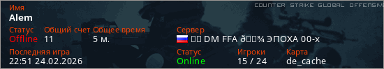 Играет на Counter Strike Global Offensive сервере. Страна: РоссияПервый раз замечен 22:49 24.02.2026