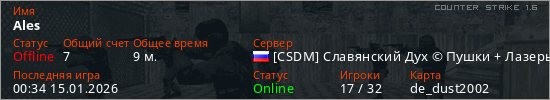 Играет на Counter Strike 1.6 сервере. Страна: РоссияПервый раз замечен 21:25 02.01.2026