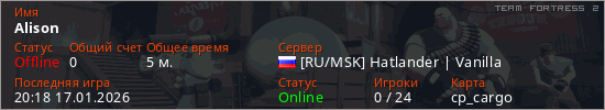 Играет на Team Fortress 2 сервере. Страна: РоссияПервый раз замечен 19:55 17.01.2026