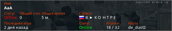 Играет на Counter Strike 1.6 сервере. Страна: РоссияПервый раз замечен 21:20 03.04.2026