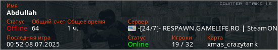 Играет на Counter Strike 1.6 сервере. Страна: СШАПервый раз замечен 03:27 31.01.2025