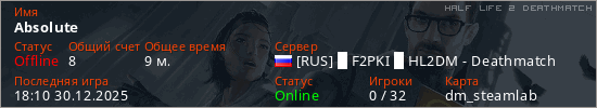 Играет на Half Life 2 DeathMatch сервере. Страна: РоссияПервый раз замечен 18:00 30.12.2025