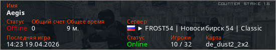 Играет на Counter Strike 1.6 сервере. Страна: РоссияПервый раз замечен 10:37 11.04.2026