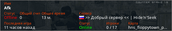 Играет на Counter Strike 1.6 сервере. Страна: РоссияПервый раз замечен 21:13 10.01.2026