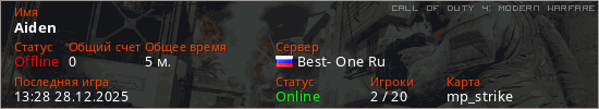Играет на Call of Duty 4: Modern Warfare сервере. Страна: РоссияПервый раз замечен 13:12 28.12.2025