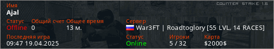 Играет на Counter Strike 1.6 сервере. Страна: РоссияПервый раз замечен 20:26 16.02.2025
