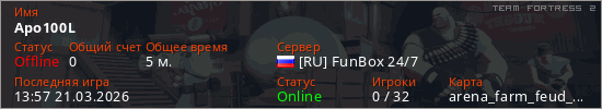 Играет на Team Fortress 2 сервере. Страна: РоссияПервый раз замечен 13:47 21.03.2026