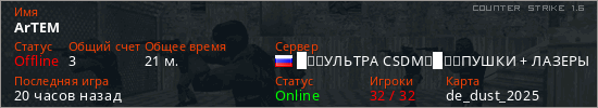 Играет на Counter Strike 1.6 сервере. Страна: РоссияПервый раз замечен 14:57 26.03.2026