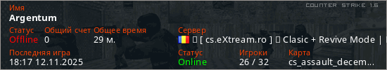 Играет на Counter Strike 1.6 сервере. Страна: РумынияПервый раз замечен 15:54 20.09.2025
