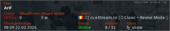 Играет на Counter Strike 1.6 сервере. Страна: РумынияПервый раз замечен 09:37 22.02.2026