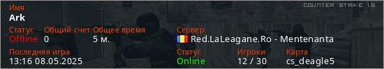 Играет на Counter Strike 1.6 сервере. Страна: РумынияПервый раз замечен 13:09 08.05.2025