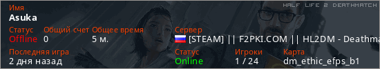 Играет на Half Life 2 DeathMatch сервере. Страна: РоссияПервый раз замечен 14:39 04.04.2026