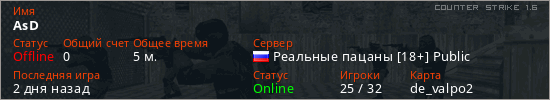 Играет на Counter Strike 1.6 сервере. Страна: РоссияПервый раз замечен 16:17 17.04.2026