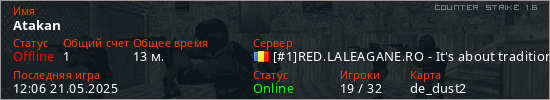 Играет на Counter Strike 1.6 сервере. Страна: РумынияПервый раз замечен 23:39 20.05.2025