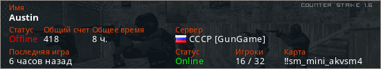 Играет на Counter Strike 1.6 сервере. Страна: РоссияПервый раз замечен 19:22 30.12.2025